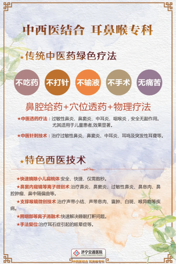 中西医结合耳鼻喉专科成立于1992年,是我院特色品牌科室,是任城区卫生局评定的”群众满意服务窗口“,是我市基层临床重点专科,北大一院、北京中日友好医院是我院常年友好协作单位,科室医务人员多次到上述友好医院进修学习并常年保持业务协作关系。科室拥有国内先进的鼻内镜显示系统、手术动力系统、等离子射频治疗仪、激光治疗仪、多导睡眠监测仪、耳内镜、鼻咽喉纤维镜、支撑喉镜、中医定向透药等设备。中西医结合治疗耳鼻咽喉科常见病、疑难病的诊治,对声嘶、咽炎、鼻炎(鼻窦炎、鼻息肉)、中耳炎、鼾症等有独特疗效。